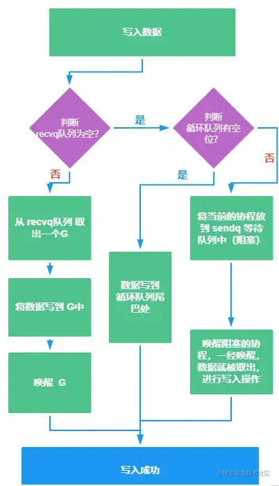 - 写入数据的时候,若recvq 队列为空,且循环队列有空位,那么就直接将数据写入到 循环队列的队尾 即可
