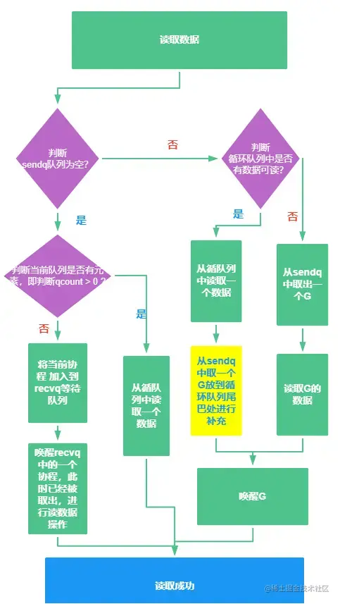 - 若sendq有数据,且循环队列无元素的时候,则从sendq取出一个G,并且唤醒他,进行数据读取操作