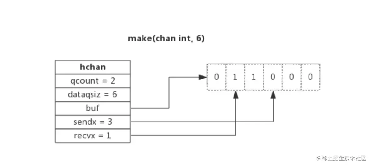 chan内部实现了一个环形队列作为其缓冲区,队列的长度是创建chan时指定的。