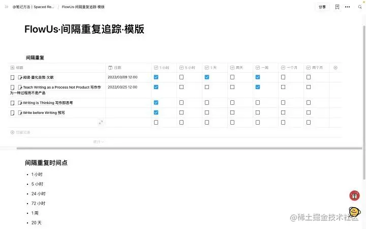 如图,根据间隔重复原理,我使用 FlowUs 制作了一个简单的间隔重复追踪模版。