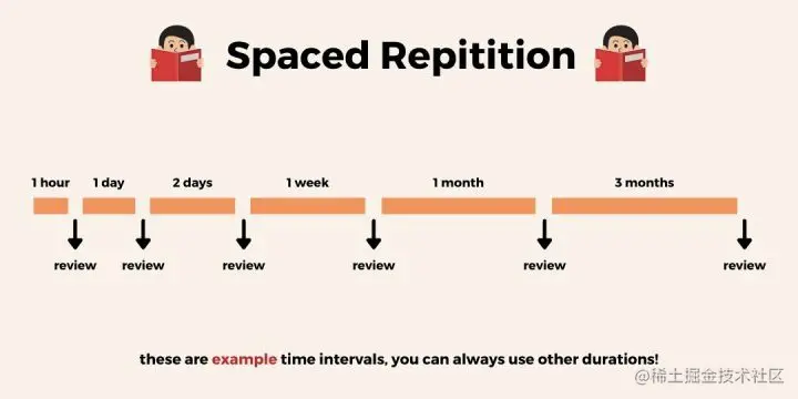 那么,为了强化记忆,便需要根据记忆的遗忘规律,使用对抗的记忆系统。这便是间隔重复,主张按照一定的间隔对你的所学知识进行复习,以便将你新学习的内容固定到你的脑海。间隔重复作为一种分布式的记忆强化方法,比那种主张大规模密集性的对内容进行回顾对集体回忆方法更为有效。