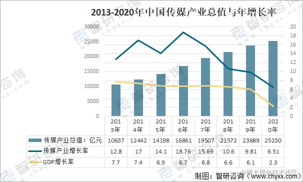2020年,受新冠肺炎疫情影响,2020年中国传媒产业的总体规模仍然保持增长,但增速有所下降。中国传媒产业总产值规模达25229.7亿元,较2019年增长6.51%。2021年中国国传媒产业的经济环境好于2020年,但互联网传媒业正面临更为严格的强监管,外部环境的深刻变化将会在长期内促进互联网进行变革和转型。