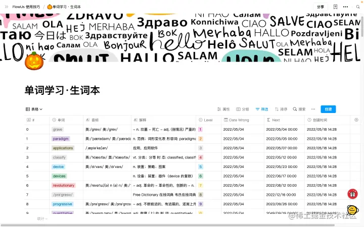 Level 对需要复习的内容进行评级。从公式可以看到,不同级别的内容,所需要间隔重复的天数不一样。如图,我为图中的单词设定了相同的最近复习时间,由于级别的不同,导致下一次复习时间并不相同。
