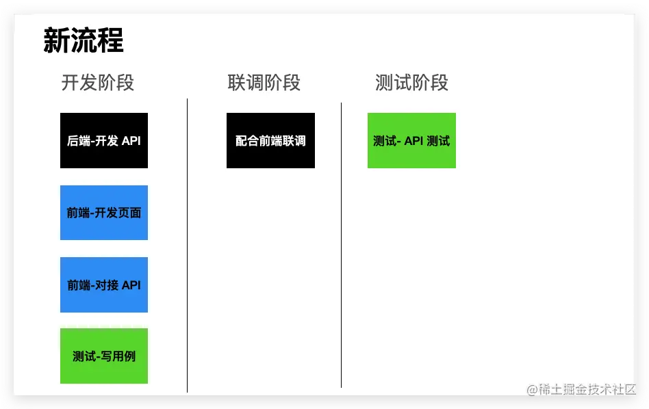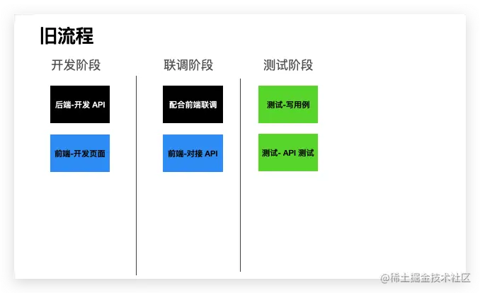 后端先开发 API,开发完了写了文档告诉前端,前端等文档好了之后再对接,最后提交给测试。