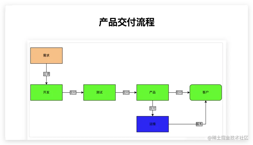 产品经理提出功能需求,说这个产品要设计成什么样子,开发接到需求之后,根据需求开始开发,开发完了提交测试,测试完了迭代上线,然后产品验收后让运维人员发布上线。