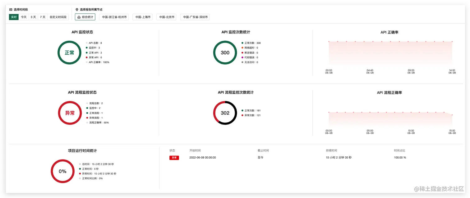 上线之后,某些关键业务比如说登录、购买功能挂了的话对产品影响会很大,所以要对这些 API 进行监控——按照一定频率发起 API 请求。