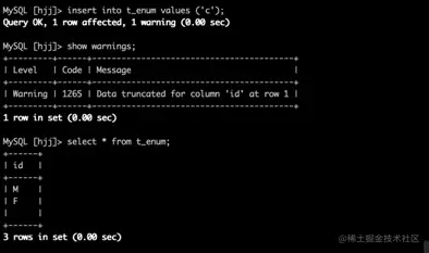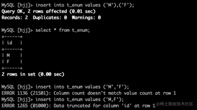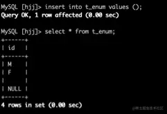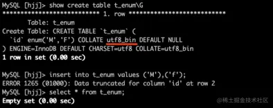 当插入的值不符合ENUM列定义时,会直接报错。注:这里小写的f插入会报错是因为校对规则是utf8_bin,此校对规则会区分大小写。