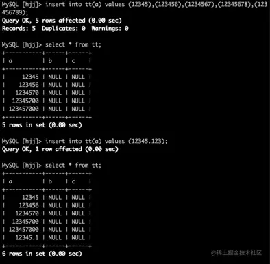 如果插入值的精度高于实际定义的精度,系统会自动进行四舍五入处理,使插入的值符合我们的定义。所以在一些需要精确小数的情况下,比如:财务工资类型这种场景,请不要使用FLOAT和DOUBLE。