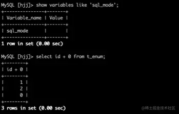 - 如果在ENUM中插入无效值(即,在定义值列表中不存在的值),则会插入空字符串,而不是将其作为特殊错误值。此字符串可以通过将数字值设为0来与正常的空字符串区分开。如果启用了严格的SQL模式,则尝试插入无效的ENUM值将导致错误。