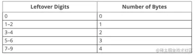 MySQL中DECIMAL以二进制格式存储值。每4个字节存9个数字。这种存储方式对于整数与小数部分是分开存储的。每9个数字需要4个字节,剩下的数字所需的存储空间如下所示:
