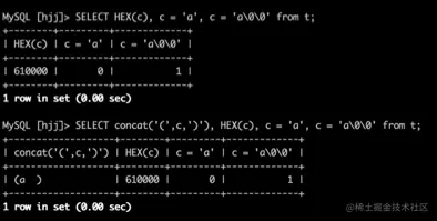 对于CHAR和VARCHAR来说,比较的是字符本身存储的值;对于BINARY和VARBINARY来说,比较的是二进制的值。