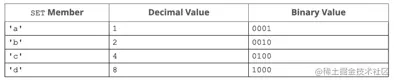 对于指定的列SET(‘a’,’b’,’c’,’d’),成员具有以下十进制和二进制值: