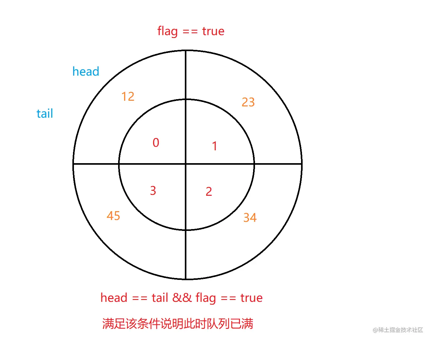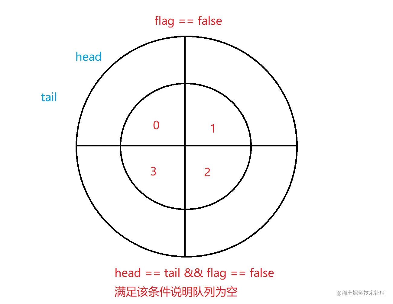 - 每次的入队操作都将 flag 置为 true , 每次的出队操作都将 flag 置为 false