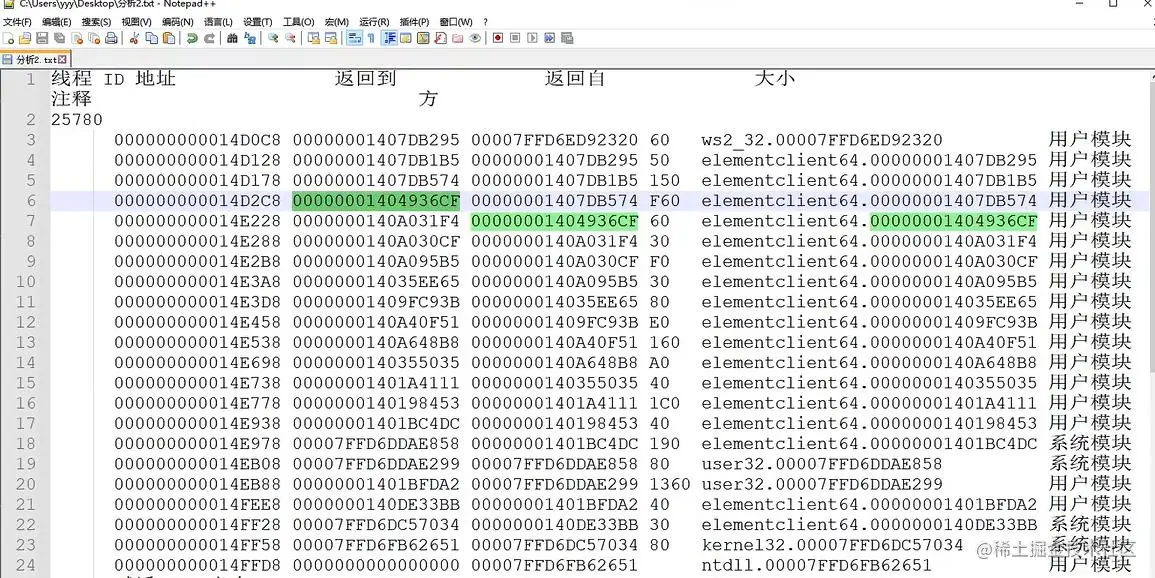 5.新建分析文本,粘贴整个表格,只留下主线程,在第三层74开始分析