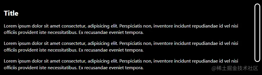 另一个关于我们如何使用系统颜色来调整体验的简单例子是我们在上一节中看到的:滚动条!这就是我们的结果。让我们假设,由于某些原因,透明边框不是一个选项。在这种情况下,我们可以使用系统颜色来使我们的滚动条在这种模式下看起来很好让我们回到我们之前使用的一个例子,我们不使用透明边框,而是使用媒体查询来调整滚动条的拇指颜色。