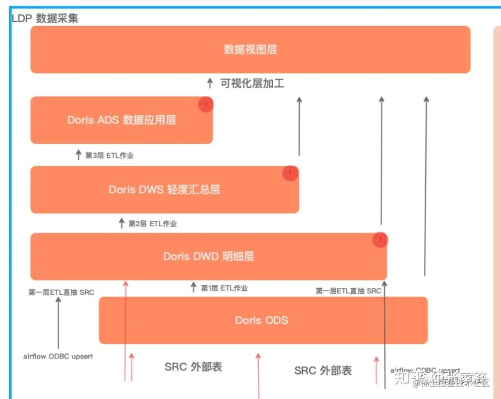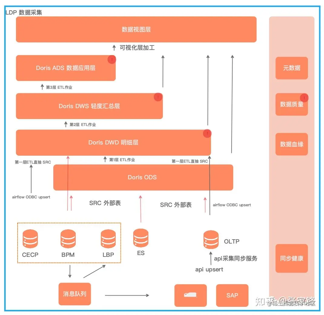 数据采集:LDP 目前实现主要是分钟级和小时级任务,支持两类采集,一类定时 API 增量采集,一类定时 OLTP 数据源增量采集,OLTP 增量采集直接构建在 Airflow,通过 Doris 连接 OLTP 从库数据源进行自定义规则采集。