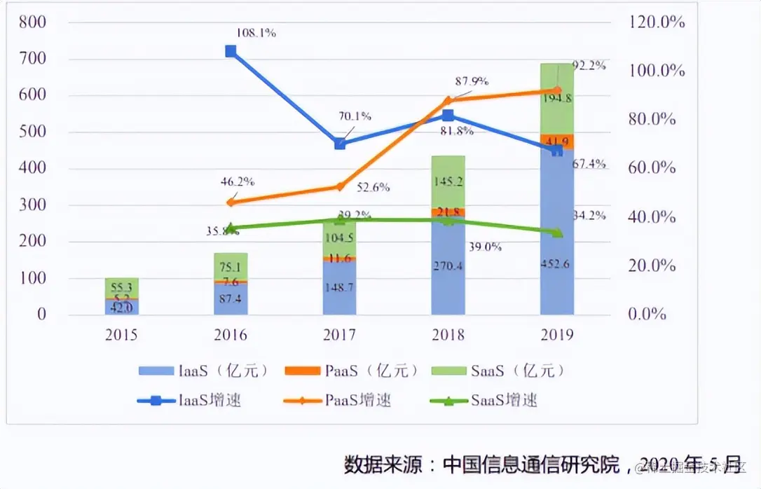 从以上数据可以得出结论:全球云计算市场规模仍在不断扩大,但是增速在下降。如果仔细分析,就会发现增速下降主要是IaaS,SaaS增长速度有所放缓,PaaS还在极速增长,这一点在我国的云计算市场尤其明显。