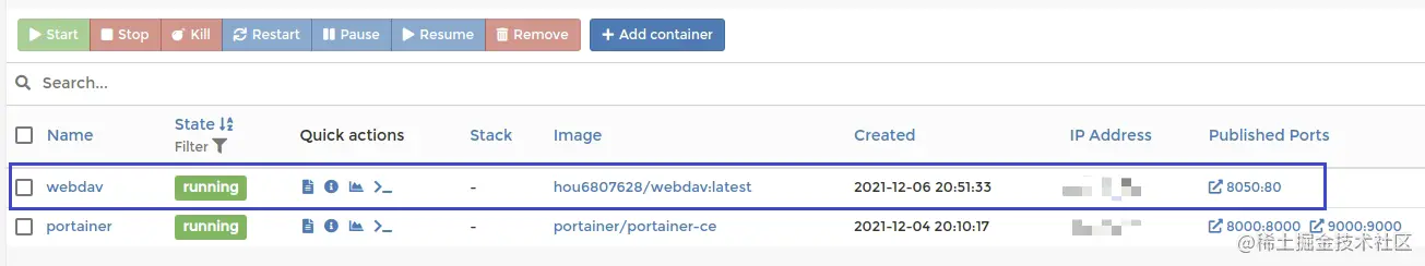 - 创建完成,可以在 portainer 中看到建立好的容器