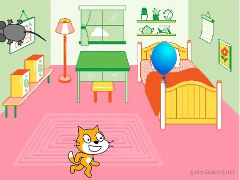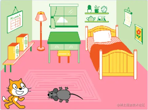 (1)初始的背景为Bedroom1,小猫的初始位置在屏幕左下角,面向右边,Mouse1在小猫不远处,面向左边;