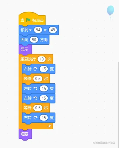 (2)点击绿旗,气球左右旋转飘动效果;老鼠看到猫后,吓得赶紧掉头(面向右边)逃跑。