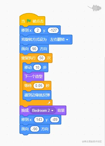 (3)小猫看到老鼠后,往前走一段(切换造型),并发出喵叫;