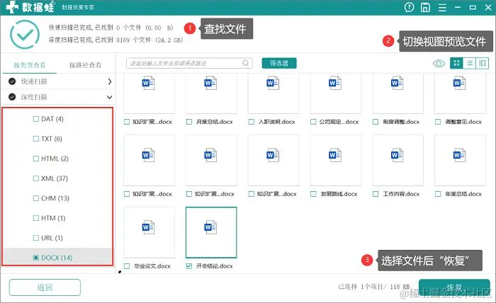 第3步:找到自己需要的文件(左侧扫描结果或者通过搜索都可进行查找)后,确认选择,点击“恢复”!
