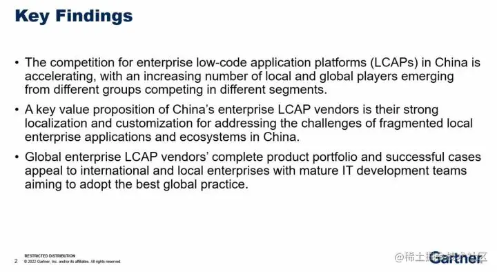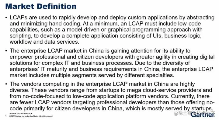 当前,大部分国内服务商都提出了面向非计算机专业人员的「低代码应用平台」。这种情况满足了很多本地客户需求。但 Gartner 认为,技术提供商仍然需要发展更深一层的工具,支持较为专业的开发者构建「定制化应用」。