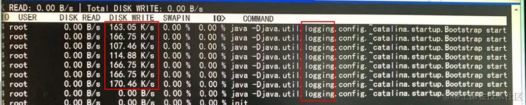 2)iotop命令或pidstat -d 1,查看IO排名,看是否有进程在一直读写操作。发现有多个磁盘写操作的记录,logging操作是日志相关的线程