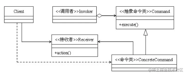 顾名思义,命令模式就是对命令的封装,首先来看一下命令模式类图中的基本结构: