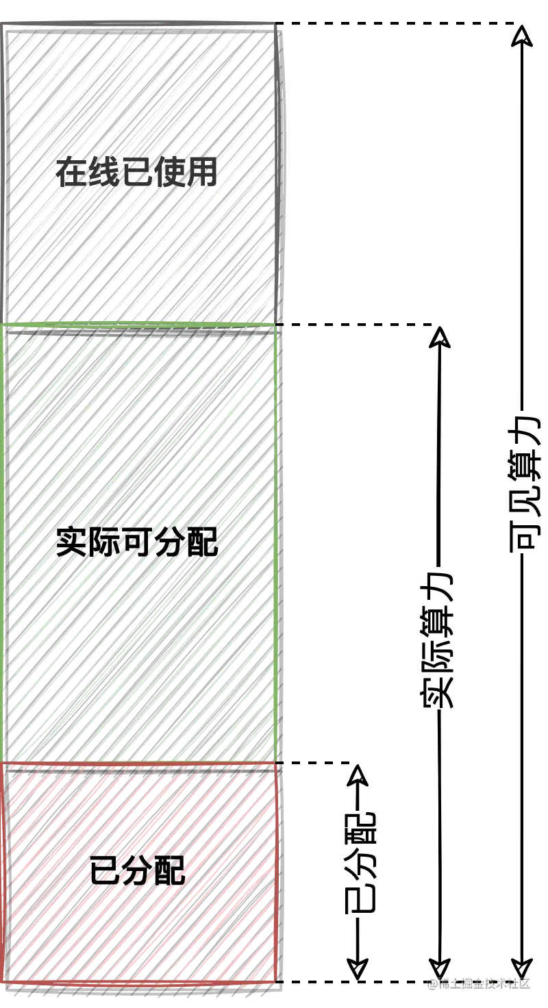 从1.2节中我们可以知道,腾讯星辰算力使用了基于离线虚拟机的混部方案,节点实际的 CPU 可用核心数会收到在线业务的峰值影响从而变化。因此,kubelet 通过 cadvisor 在离线宿主机内部采集到的 CPU 核心数并不准确,这个数值是一个固定值。因此,针对离线资源我们需要调度器通过其他的方式来获取节点的实际算力。