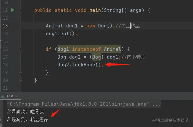 大家可以看到,dog2对象可以调用Dog类的lockHome()方法,该dog1是无法调用的,但dog2可以调用,这就是向下转型所致。