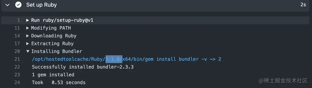 也许这是一个错误或错误的设计,在setup-ruby 行动。但是,为了代替任何开发人员决定这是一个bug......引用你的3.0 版本号,或者干脆引用所有使用setup-ruby任务的ruby版本号?