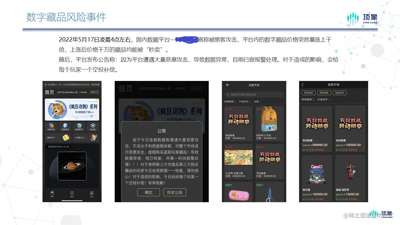 5月17日,某著名数字藏品平台,数据库被黑灰产攻击,利用虚假余额购买盗取玩家藏品,使得数字藏品的价值,瞬间疯涨上千倍,近千万元价格的藏品均被“秒卖”,事后平台报警。这对于真正参与数字藏品的玩家,于其中并没有得到任何收益,甚至造成了大量资产损失,而黑灰产,则将上千万的数字数字藏品轻松到手。除此之外,自该平台上线以来,曾多次出现系统问题,包括用户无法登录、卡顿、服务器繁忙报错、验证码频繁输入等问题。