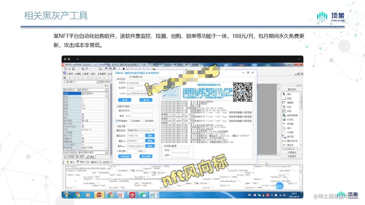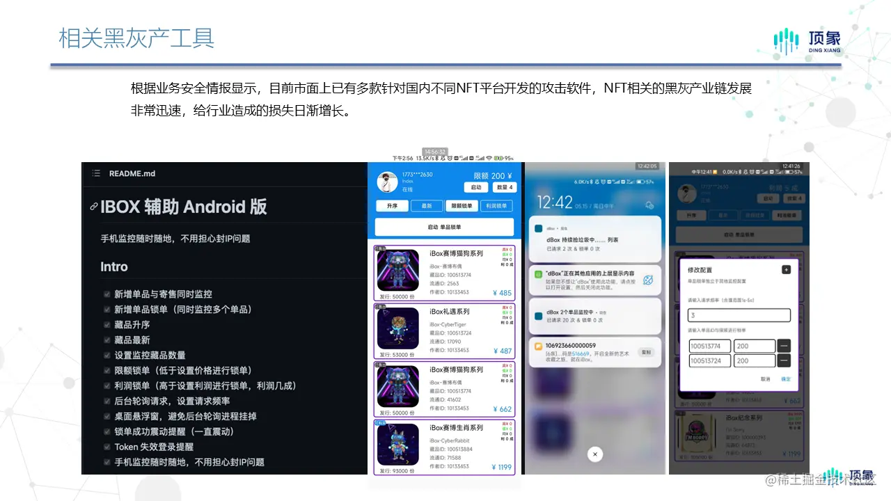 此外经过顶象长期跟踪监测,国内当下已涌现出了非常多的NFT/数字藏品交易平台,黑灰产凭借强大的技术能力以及敏锐的市场嗅觉,使得每个平台都已出现一款甚至多款针对性的攻击软件。这些攻击软件均可实现监控数字藏品的上线、锁单、提醒、利润分成等基础的自动化能力。