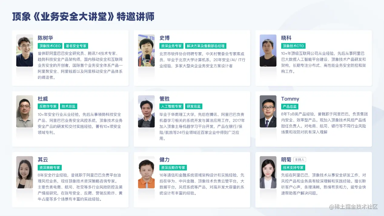 《业务安全大讲堂》系列直播课由顶象倾力打造,汇集安全业内大咖组建豪华讲师天团,分享万亿级业务安全攻防经验,打造时下最专业的业务安全直播课!