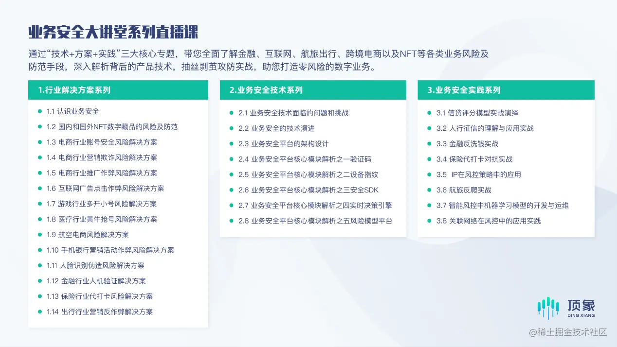 通过“技术+方案+实践”三大核心专题,带您全面了解金融、互联网、航旅出行、跨境电商以及目前大热的NFT/数字藏品等各类业务风险及防范手段,深入解析背后的产品技术,抽丝剥茧攻防实战,助您打造零风险的数字业务。