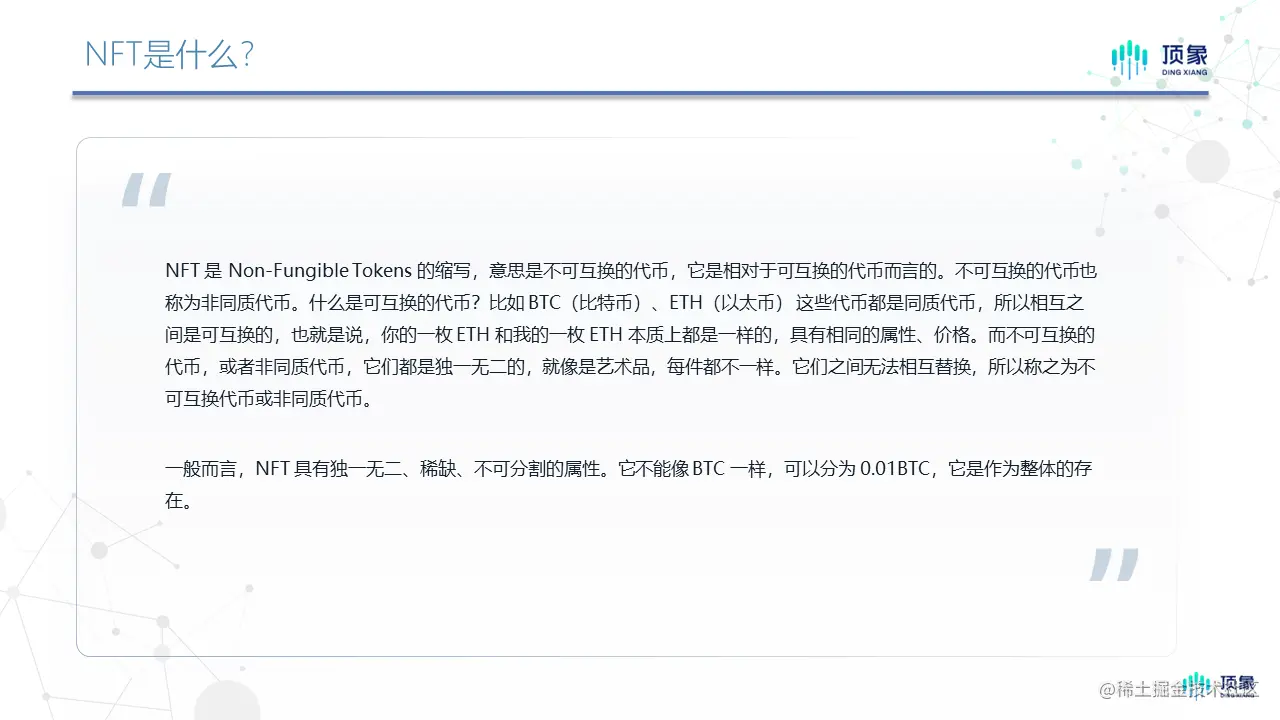 NFT和数字藏品的关系可谓是相近但不同。NFT(Non-Fungible Token)是基于区块链技术的一种非同质化代币,本质上是加密货币的一种。NFT的创新之处在于它在区块链平台上得到确权,具备唯一性,且不可篡改和复制。理论上“万物皆可NFT”,利用NFT技术所形成的数字资产可以是一张动图、一幅画、一个头像、一段视频,甚至是一段文字内容。因为发行和流通平台的去中心化,使得这种数字资产更加公开、透明、难以伪造和虚增,因而成为密码货币和token之后新的投资热点。