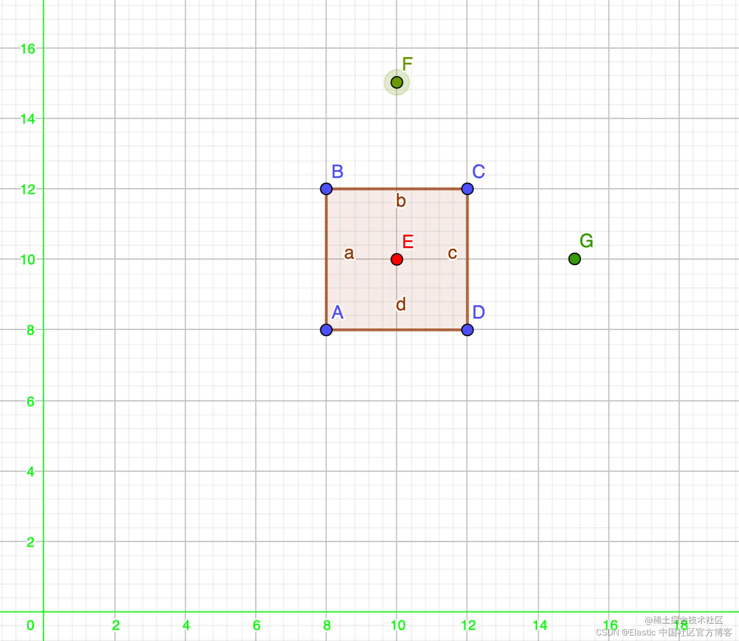在上图中,A->B->C->D->A 这个形状是我们的 shape,而 E,F,G 三个点是在索引 test-point 里定义的三个文档所处的位置。显然针对上面的 test-point 的搜索,只有 E 点在 shape 之内。上面的搜索的好处是,我们可以随时更改 test-shape 里的形状而使用同样的一个搜索来进行。它可以关联两个索引。