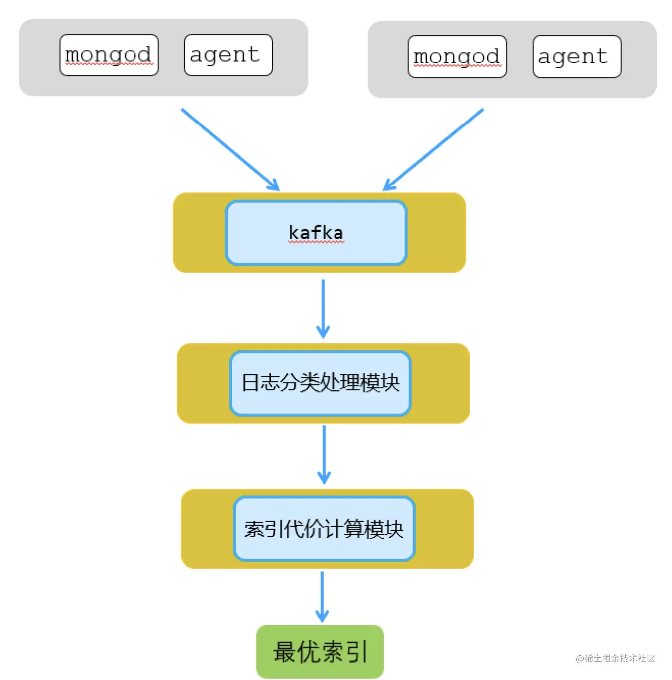代价估算模块:模拟 MongoDB 内核执行计划过程,进行候选索引代价估算。系统整体的工作流程如下:每个 MongoDB 节点上布署有 agent 节点,它会实时采集所有有用的日志并存储到 Kafka 里,日志分类处理模块会从 Kafka 里把需要的日志提取出来进行分类,然后把分类好的日志交给索引代价计算模块进行计算,最终得到最优索引。