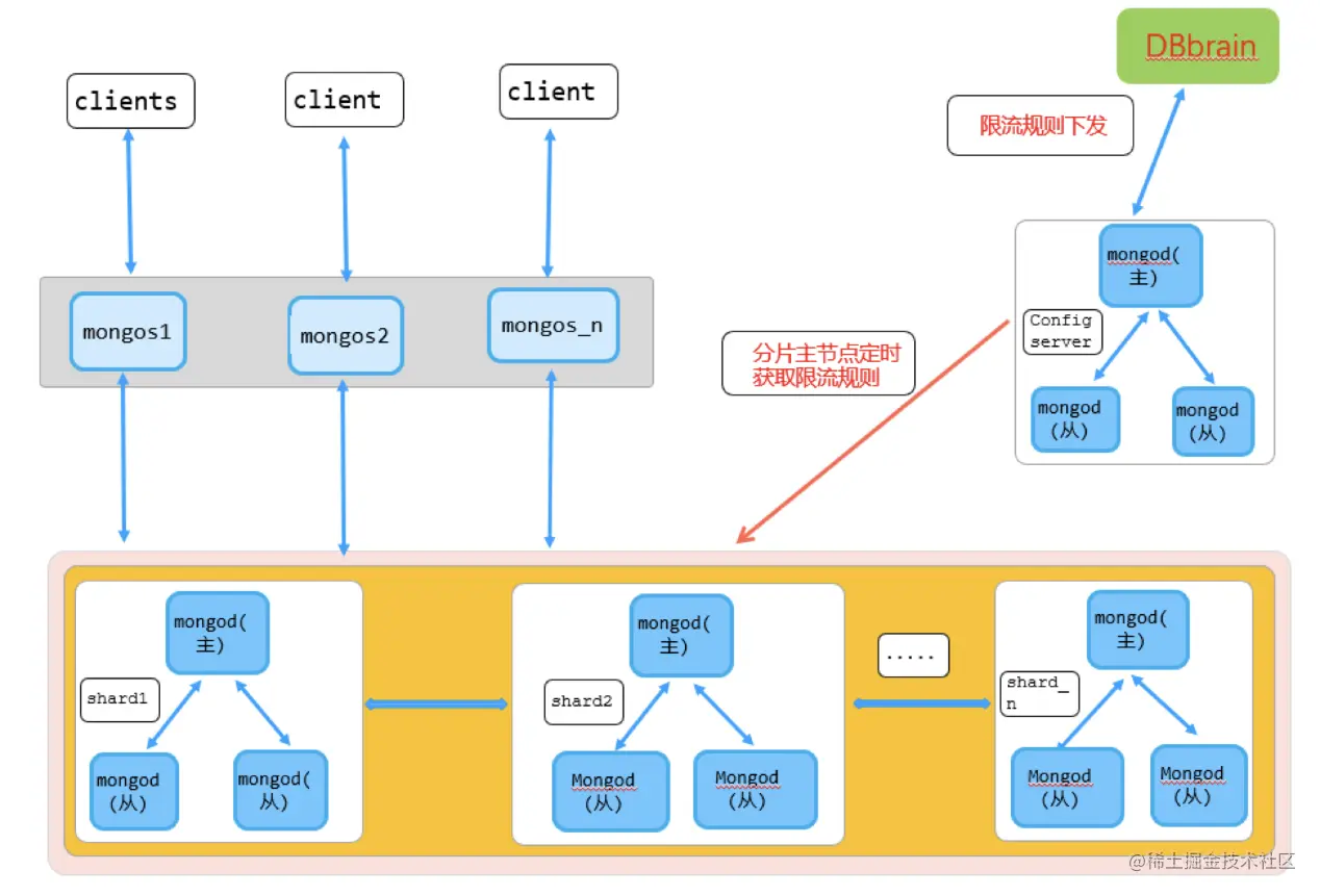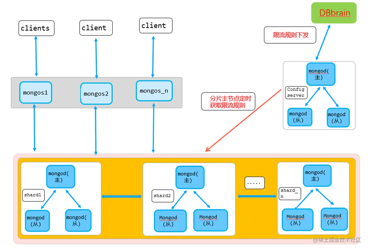 然后,是根据读写 SQL 关键字,配置完规则,就可以对指定库、表或者指定的 SQL 语句做限流。整个流程是首先在 DBbrain 的控制台下发规则,以分片集群为例,就下发给分片集群的 config server,config server 接收到后把这个规则写到 config server 的一个表里,shard server 的每个 mongod 定期从 config server 获取这些规则并加载到自己内存里,所有的 mongod 节点内存里就会有完整的规则数据存在,当发起一个请求,通过客户端到代理,再到 mongod 节点的时候,进行限流规则匹配,触发限流操作。