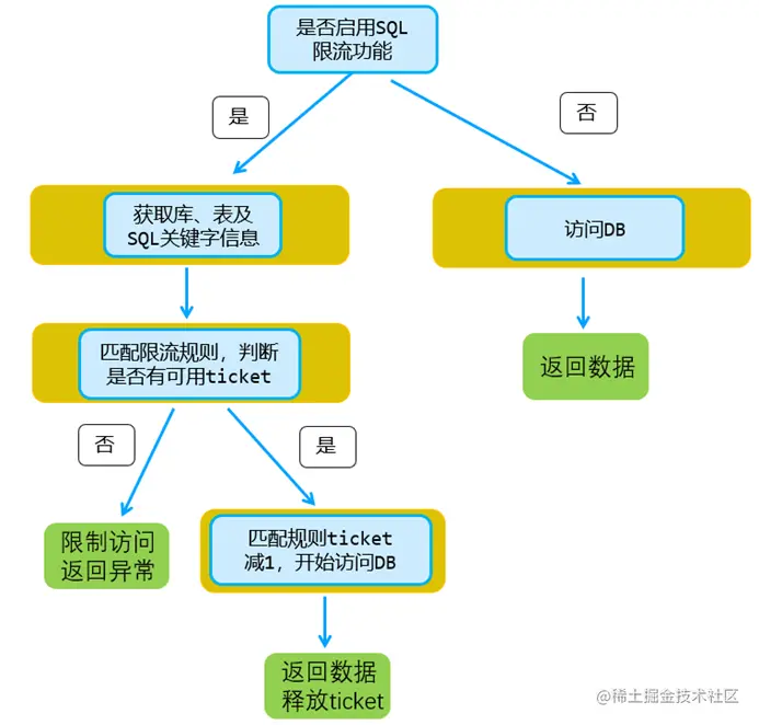 当一个请求到达 MongoDB 后,具体的处理流程是,先看这个实例是否启用了 SQL 限流功能,如果已启用,则提取用户请求中的库、表和 SQL 关键字信息,下一步和配置的限流规则做匹配,判断这类 SQL 是否有可用的 ticket。