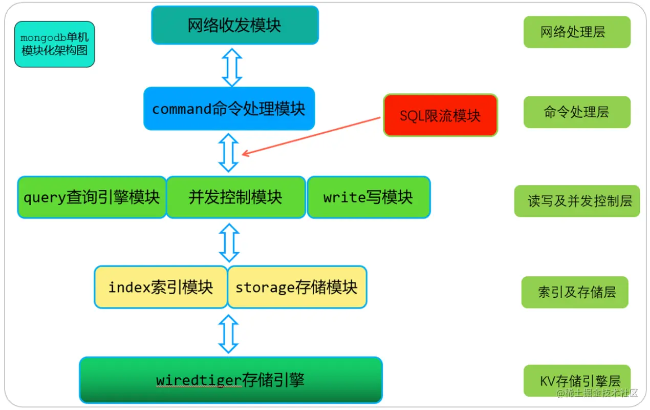 先捋一下 MongoDB 的整体架构,它是分层的,第一层是网络收发模块,网络收发过后,交由命令处理模块把这些 SQL 解析出来,然后这些 SQL 会进入查询引擎模块、读写模块以及并发控制模块等流程。