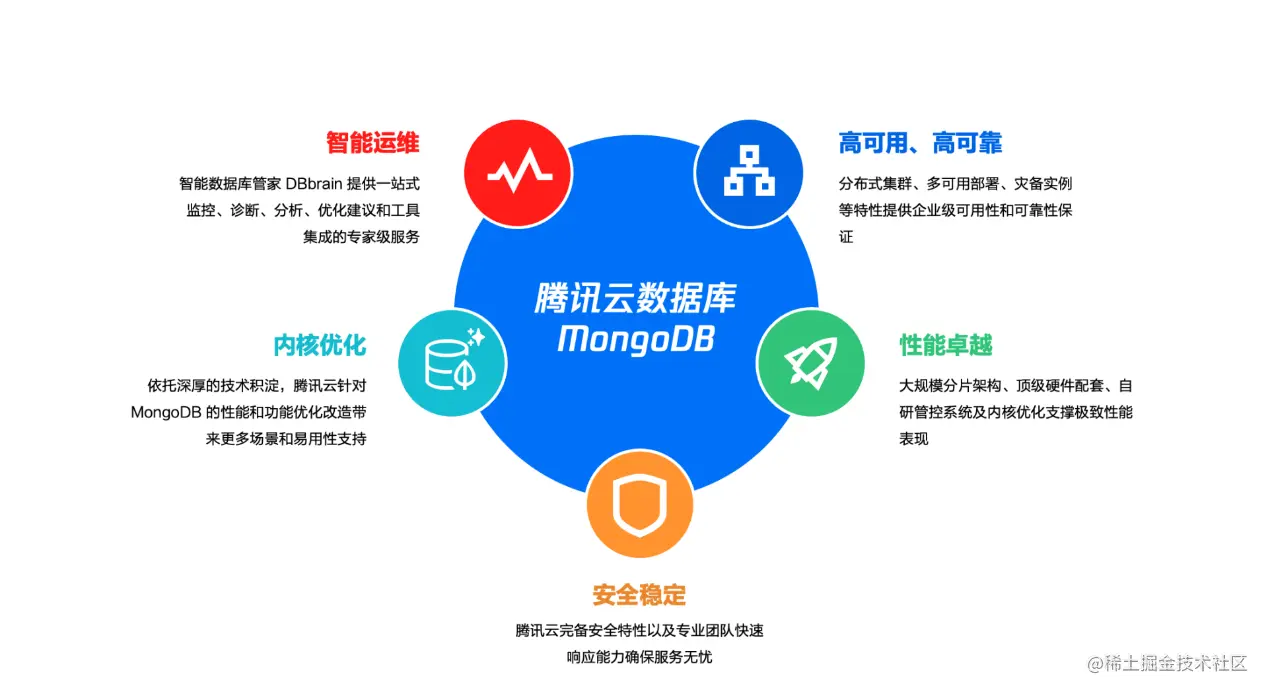 相比用户自建 MongoDB 数据库,腾讯云 MongoDB 在智能运维、可用性、安全性、性能等方面更具优势。同时通过 DBbrain 提供一站式监控的诊断分析,并且能给出相应的优化建议,同时也集成了官方的常用工具,让用户使用更方便。