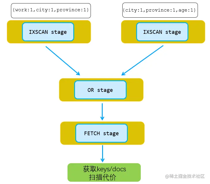 假设有 [{work:1, city:1, province:1}, {city:1, province:1, age:1}]) 这个候选索引,其代价计算过程如下图所示: