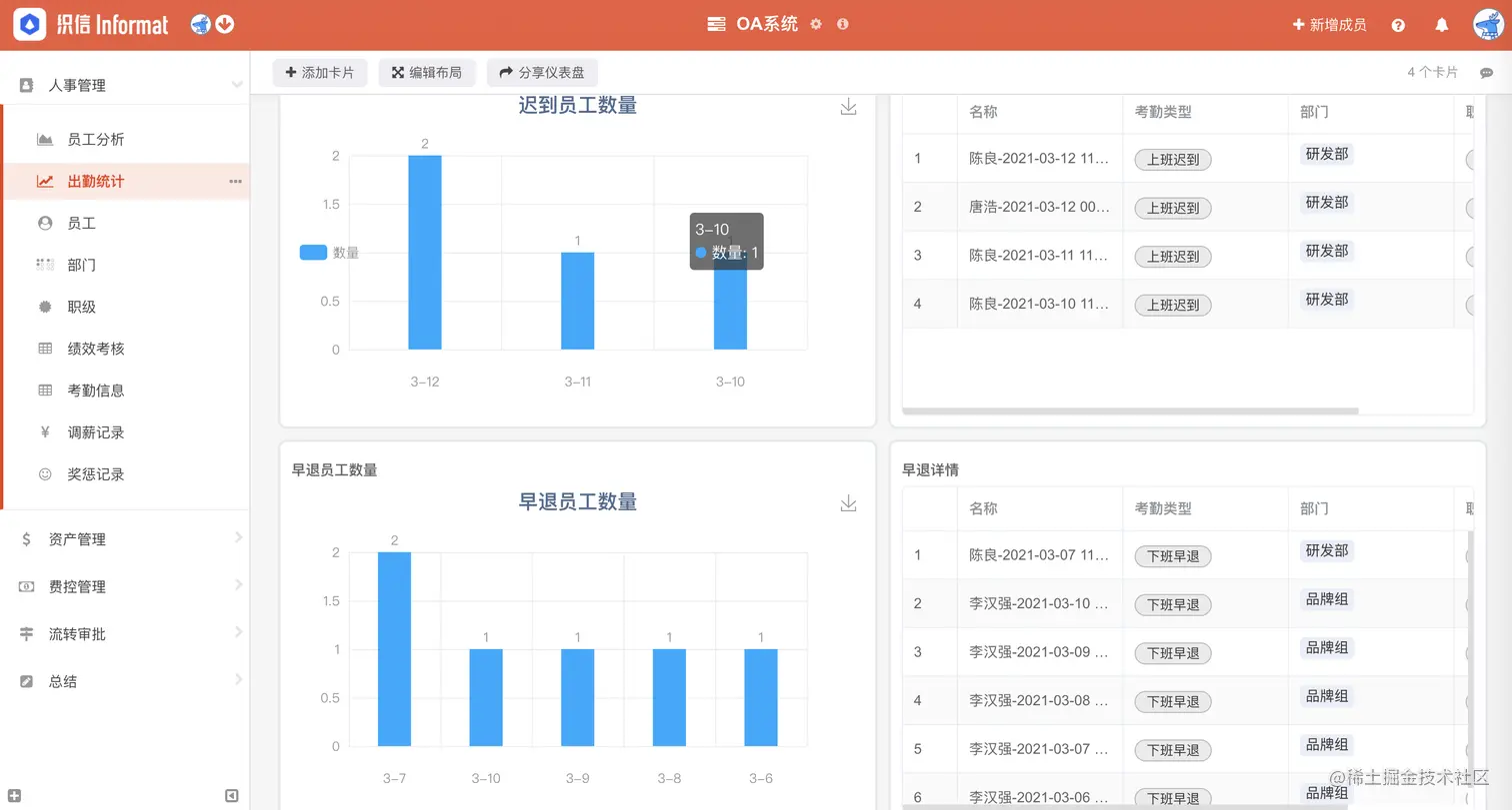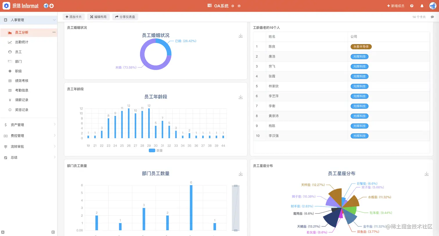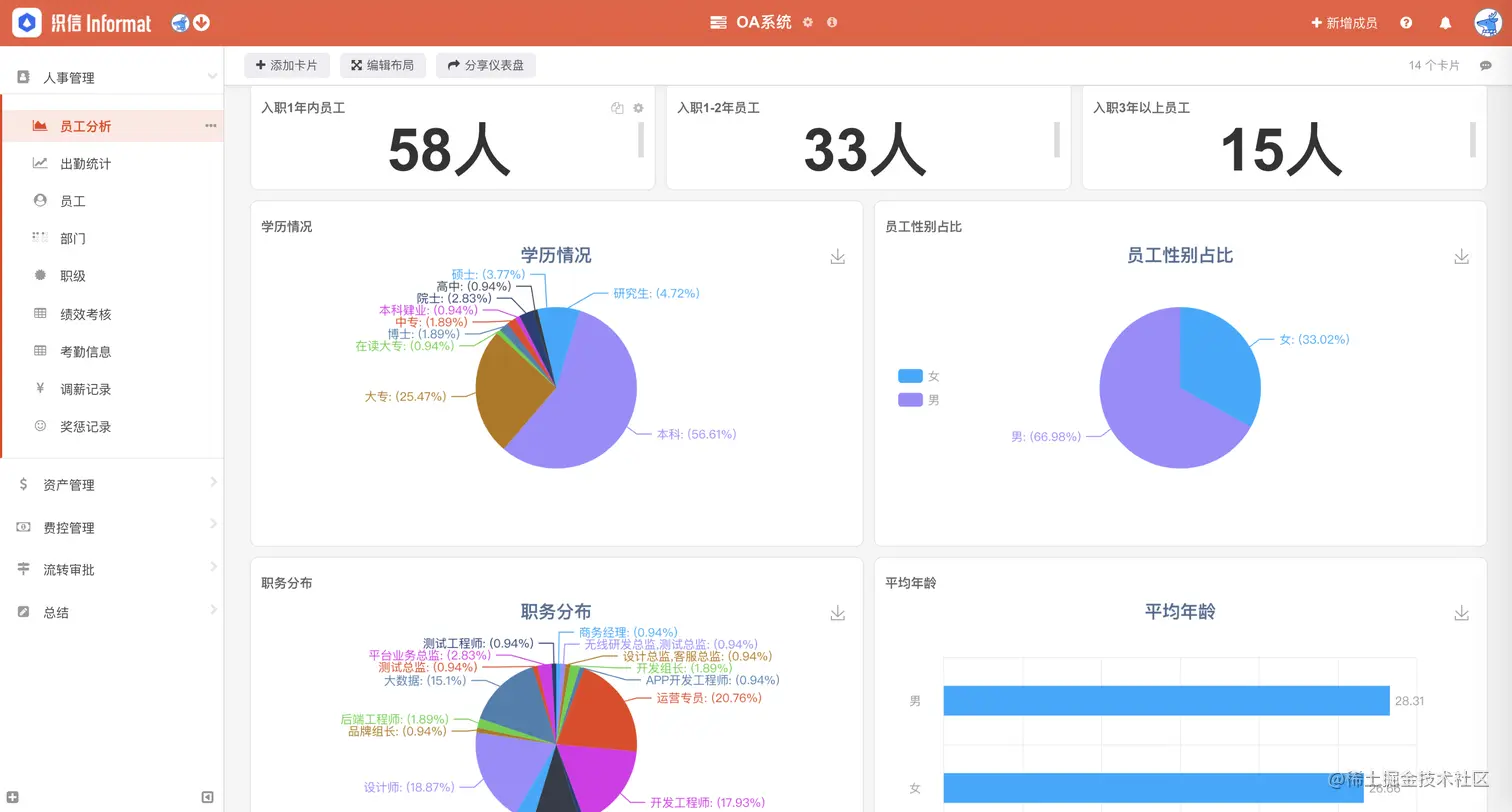 员工分析:根据员工表中的信息生成分析图表,可以汇总员工各类信息归集为可视化报表,提升人事管理效率。