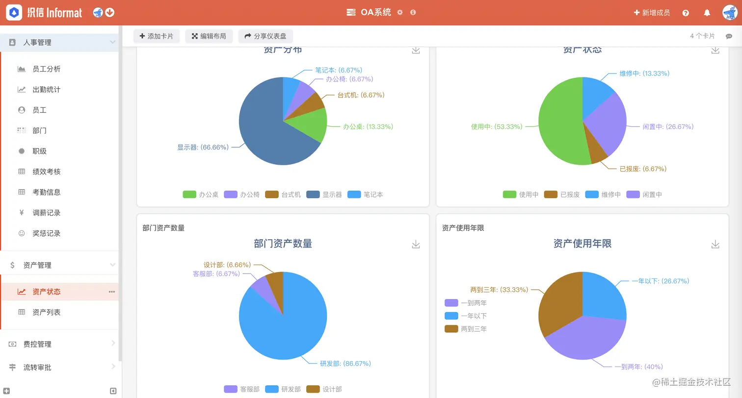 资产分析:对企业资产进行数据分析,可以统计资产在各个部门的分布,资产整体折旧信息,资产类型的占比和各状态资产的汇总。