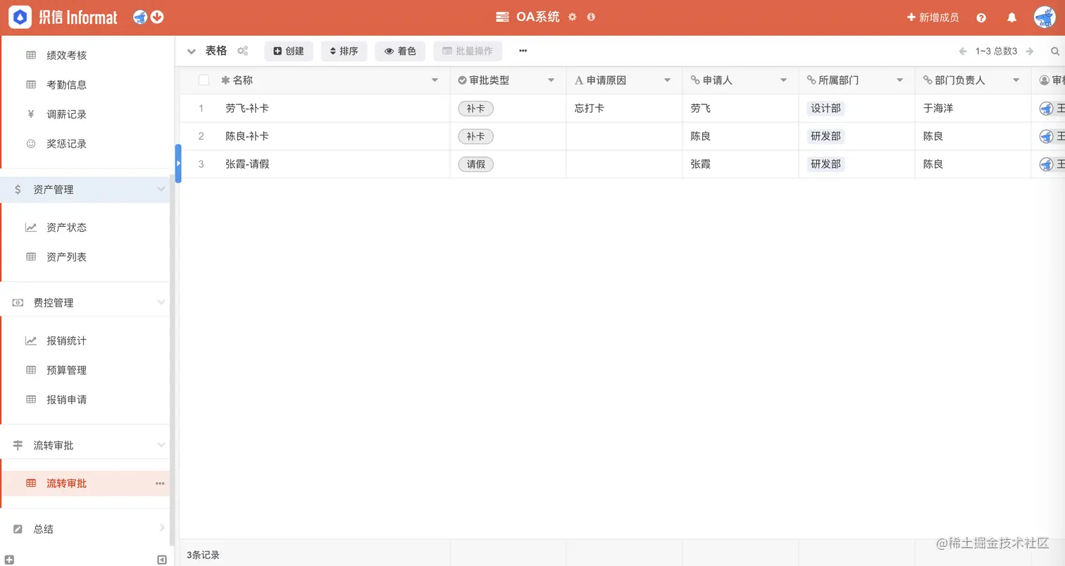 流转审批:实现员工各类申请的审批流转,并进行存档统计。