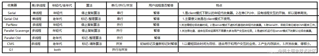 Serial:单线程收集器,是client模式下默认的年轻代收集器。采用停止复制算法,进行垃圾回收时必须暂停用户的所有进程。优点是简单高效。在单CPU的环境中,由于没有线程交互的开销,专心做垃圾收集,所以在这种情况下相对于其他收集器是最高效地。