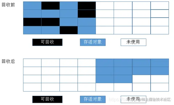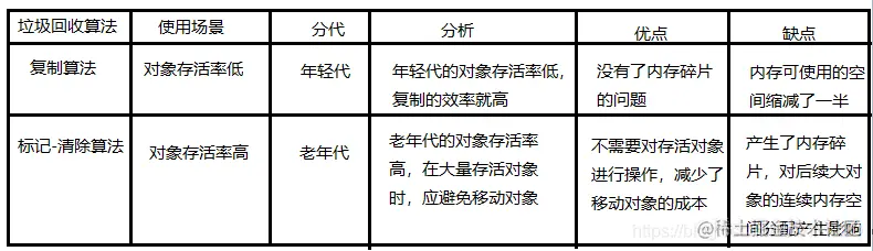用在老年代GC中。该算法是最基础的垃圾回收算法,之所以说它是最基础的是因为它最容易实现,思想最简单。该算法分为两个阶段:标记阶段和清除阶段。标记阶段的任务是标记出所有需要被回收的对象,清除阶段就是回收被标记的对象所占用的空间。标记和清除的效率都不太高,且存在内存碎片。使用场景:对象存活率较高。示意图:
