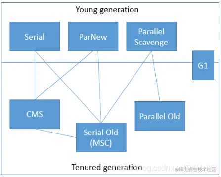 上半部分是年轻代收集器,下半部分是老年代收集器,如果收集器之间有连线,那么说明它们可以搭配使用。